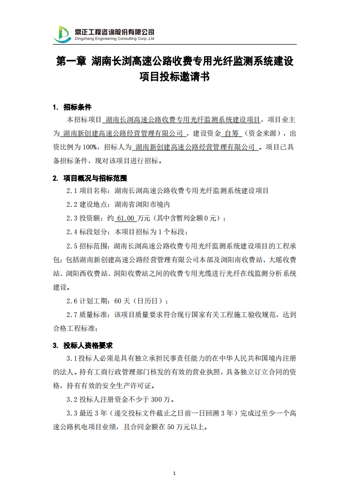 湖南長瀏高速公路收費專用光纖監(jiān)測系統(tǒng)建設項目投標邀請書