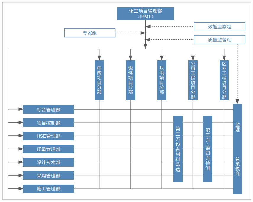 二是文件適用范圍。文件使用范圍包括PMC/IPMT團(tuán)隊(duì)內(nèi)部管控;業(yè)主與項(xiàng)目管理公司接口協(xié)調(diào)與管控;管控EPC、監(jiān)理等各類(lèi)參建單位;與政府主管部門(mén)協(xié)調(diào);覆蓋工程建設(shè)全過(guò)程(各階段、各專(zhuān)業(yè))5類(lèi)。三是文件發(fā)布。項(xiàng)目管理體系文件由PMC編制,經(jīng)業(yè)主批準(zhǔn)后發(fā)布;涉及管控EPC、監(jiān)理等參建單位的,應(yīng)列入招/議標(biāo)文件發(fā)布。四是文件的價(jià)值。迅速整合業(yè)主項(xiàng)目管理團(tuán)隊(duì)(PMC/IPMT)的工作,使其管理有序、科學(xué)合理、專(zhuān)業(yè)透明;符合法律、法規(guī)和政府監(jiān)管要求,奠定工程建設(shè)有序推進(jìn)基礎(chǔ);業(yè)主管理文件(對(duì)項(xiàng)目執(zhí)行的具體要求)列入招/議標(biāo)文件有利于承包商等投標(biāo)人進(jìn)行準(zhǔn)確報(bào)價(jià)、作出承諾和響應(yīng),縮短中標(biāo)后合同談判時(shí)間,業(yè)主管理文件成為合同附件(有法律約束力),將顯著減少合同糾紛。矩陣式管理結(jié)構(gòu),是常見(jiàn)的組織結(jié)構(gòu)形式之一。PMC/IPMT團(tuán)隊(duì)即是業(yè)主方項(xiàng)目管理團(tuán)隊(duì),是工程建設(shè)的中樞指揮機(jī)構(gòu),其組織機(jī)構(gòu)的設(shè)計(jì)至關(guān)重要。項(xiàng)目的組織結(jié)構(gòu)形式一般有:職能型、項(xiàng)目型、矩陣型。通過(guò)大量工程建設(shè)實(shí)踐驗(yàn)證,矩陣式管理結(jié)構(gòu)(矩陣型)是能夠迅速整合業(yè)主項(xiàng)目管理團(tuán)隊(duì)(PMC/IPMT)的良好的項(xiàng)目組織結(jié)構(gòu)形式(圖3)。矩陣式管理結(jié)構(gòu)特征主要包括:一是項(xiàng)目部,主要解決“干什么”,負(fù)責(zé)執(zhí)行并完成項(xiàng)目工作;二是職能/專(zhuān)業(yè)部門(mén),主要解決“怎么干”,為項(xiàng)目部提供技術(shù)支持。▲圖3 矩陣型組織結(jié)構(gòu)原理示意圖