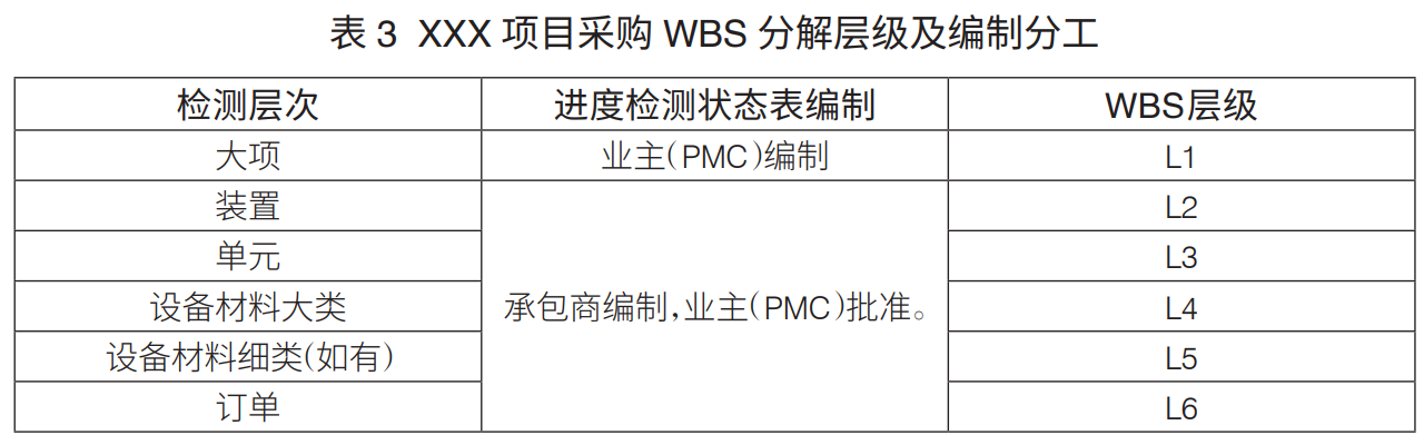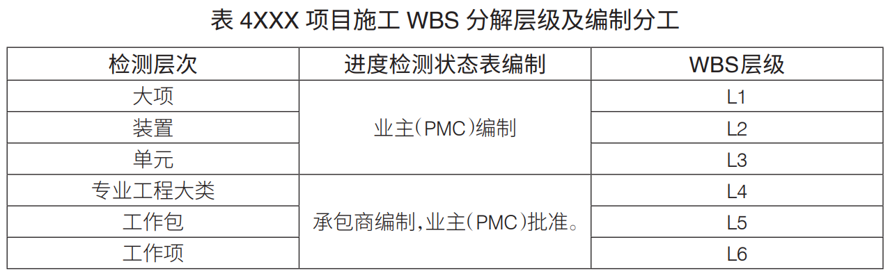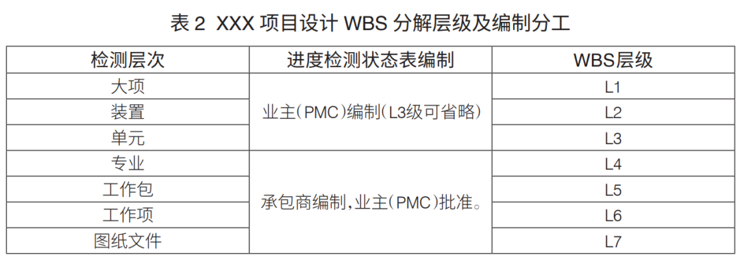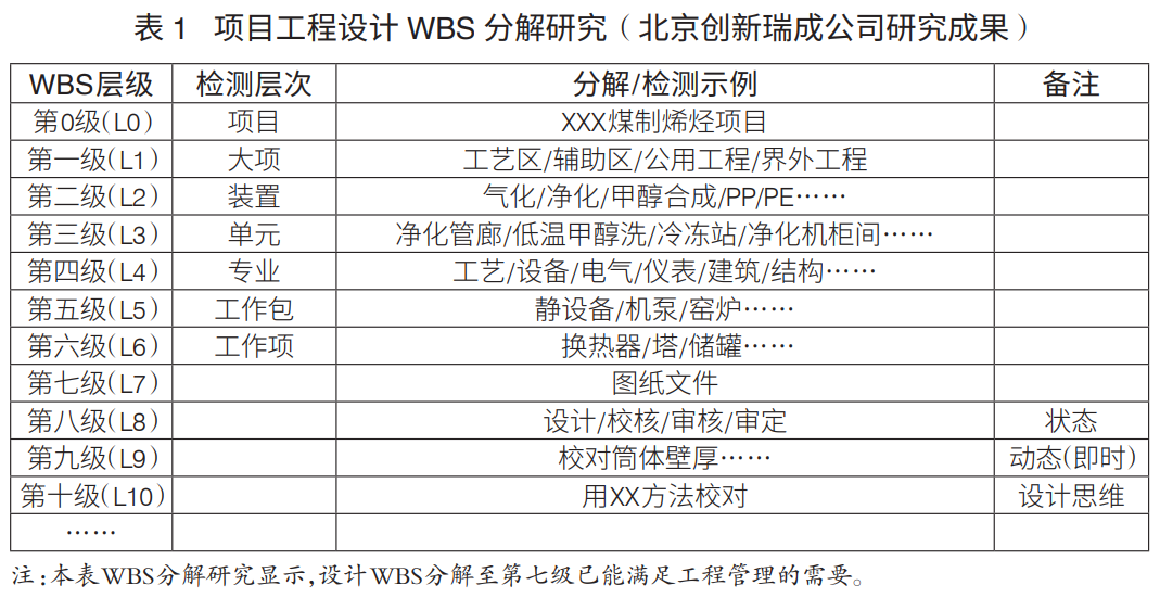 工程項(xiàng)目WBS分解層級(jí):工程項(xiàng)目WBS分解主要是進(jìn)行設(shè)計(jì)、采購(gòu)、施工WBS分解。通常,設(shè)計(jì)WBS分解至七級(jí)、采購(gòu)WBS分解至六級(jí)、施工WBS分解至六級(jí),可滿(mǎn)足工程管理要求(表1)。