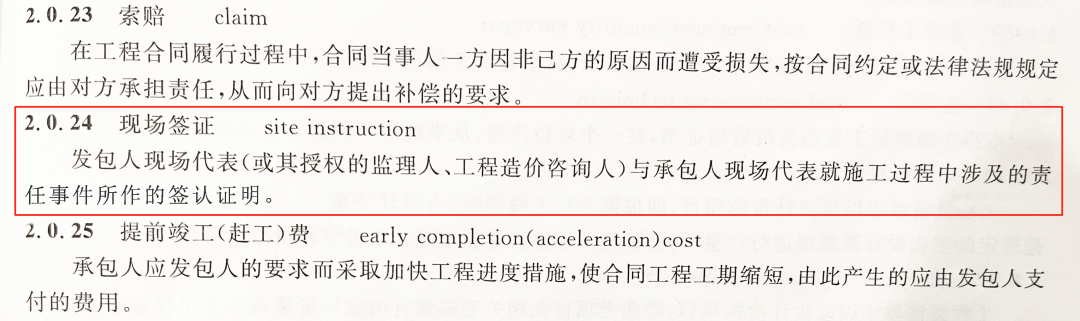 依據(jù)《建設(shè)工程工程量清單計價規(guī)范》(GB50500-2013)第2.0.24條對現(xiàn)場簽證的定義:“發(fā)包人現(xiàn)場代表與承包人現(xiàn)場代表就施工過程中涉及的責(zé)任事件所作的簽認(rèn)證明?!?/span>