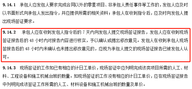 此外,第9.14.2條中,“......發(fā)包人在收到承包人現(xiàn)場簽報告后的48小時內(nèi)未確認(rèn)也未提出修改意見的,應(yīng)視為承包人提交的現(xiàn)場簽證報告已被發(fā)包人認(rèn)可?!?/span>即,從時限來講,“48小時”亦非能夠滿足發(fā)包方充分詢價并與承包方定價的時長。