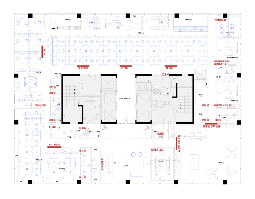 在空間規(guī)劃上,我們根據工作方式的特點,充分考慮功能與不同情境的活動需求,打造鼓勵與展示創(chuàng)意過程的空間氛圍。在這里,設計師們可以頭腦風暴、集思廣益、舌戰(zhàn)群儒;亦可以舉辦各種形式的研討與社交活動;還可作為規(guī)劃設計事業(yè)部對外展示與交流的窗口。