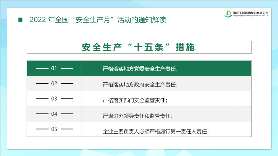 2022年全國(guó)“安全生產(chǎn)月”重點(diǎn)工作要求,1.深入學(xué)習(xí)貫徹習(xí)近平總書(shū)記關(guān)于安全生產(chǎn)重要論述,推動(dòng)落實(shí)安全生產(chǎn)十五條措施;2.宣傳貫徹安全生產(chǎn)法,推動(dòng)“第一責(zé)任人”守法履責(zé);3.持續(xù)開(kāi)展“安全生產(chǎn)萬(wàn)里行”活動(dòng),分類(lèi)強(qiáng)化警示教育;4.廣泛開(kāi)展“安全宣傳咨詢?nèi)铡焙桶踩麄鳌拔暹M(jìn)”活動(dòng),提升社會(huì)公眾安全意識(shí)和自救互救能力。