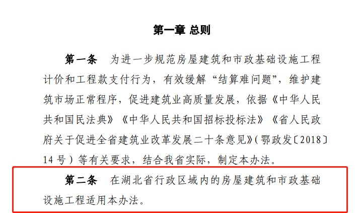 自本辦法實施之日起,湖北省內的房屋建筑和市政基礎設施工程適用本辦法,不區(qū)分資金性質。施工工程是否必須適用本《暫行辦法》,則需結合項目進展情況而定:已進行招投標或已簽訂合同的工程,仍按原約定執(zhí)行,已發(fā)包暫未確定中標單位的,招標人可發(fā)布澄清公告對結算方式進行變更,也可以按原約定繼續(xù)進行。