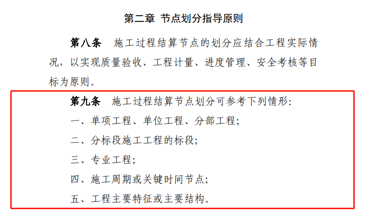 《暫行辦法》分為總則、節(jié)點劃分指導原則、招投標與合同約定、結算與支付、監(jiān)督管理、附則等六個章節(jié),共二十六個條文,具體如下