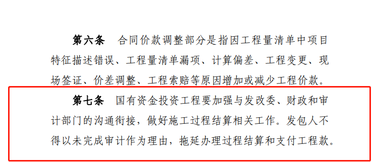 推行過程結算,建設單位應滿足施工所需的資金安排,工程驗收通過時原則上應同步完成工程款結算,不得變相拖延結算。國有資金投資工程應當按照國家有關規(guī)定確保資金按時支付到位,不得以未完成審計作為延期工程款結算的理由。在以往的建設工程司法案例中,合同雙方若在合同中約定以行政審計后的價款作為結算價款的,法院予以支持。眾所周知,行政審計一般在項目驗收完成之后進行,那么在推行施工過程結算的背景下,發(fā)包人在招標文件及合同條款中再約定以行政審計后的價款作為結算依據的,明顯與過程結算的推行意義相違背。