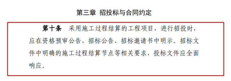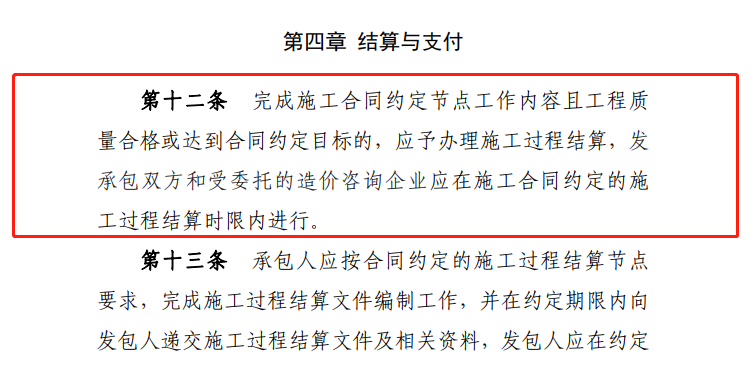 本條定義何為施工過程結算,相較住建部2021年發(fā)布的《建筑工程施工發(fā)包與承包計價管理辦法》(修訂征求意見稿)第十九條規(guī)定“全面推行施工過程結算和支付。發(fā)承包雙方通過合同約定,按時間節(jié)點或進度節(jié)點對周期內已完成且無爭議的工程量進行價款計算、確認,并按照合同約定比例支付。”《暫行辦法》增加了節(jié)點驗收,驗收是節(jié)點結算與支付的前提。