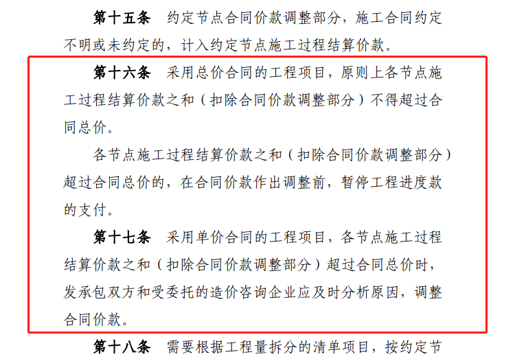 分別對總價合同的建設項目和單價合同的建設項目的施工過程結算的方式和過程進行解釋、說明??偠灾还芸們r合同還是單價合同,施工過程結算價款之和(扣除合同價款調整部分)均不得超過合同總價,否則可能出現工程未完成已支付完成的情況。具體支付比例可根據發(fā)包人資金使用計劃在合同中約定,但不得低于當地行政主管部門的相關規(guī)定。