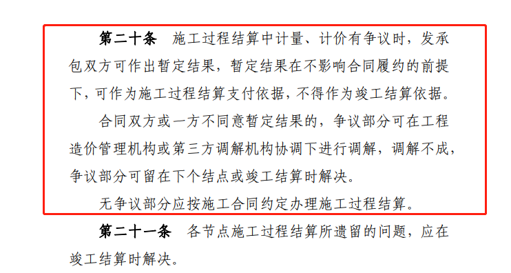 施工過程結算中計量、計價有爭議和無爭議兩種情形。對于有爭議部分,發(fā)承包雙方可作出暫定結果,并作為施工過程結算支付依據,但不得作為竣工結算依據,最終竣工結算按照雙方在調解后確定,或者在下個結點或者竣工結算時確定。