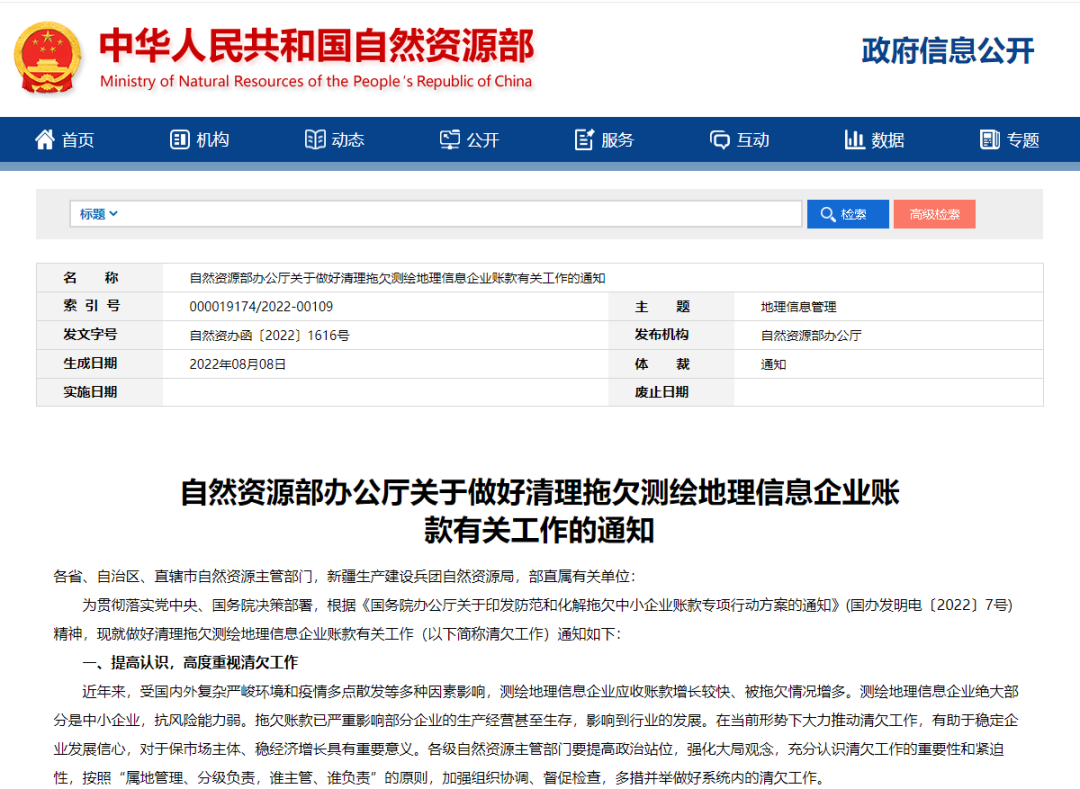 自然資源部辦公廳關(guān)于做好清理拖欠測繪地理信息企業(yè)賬款有關(guān)工作的通知