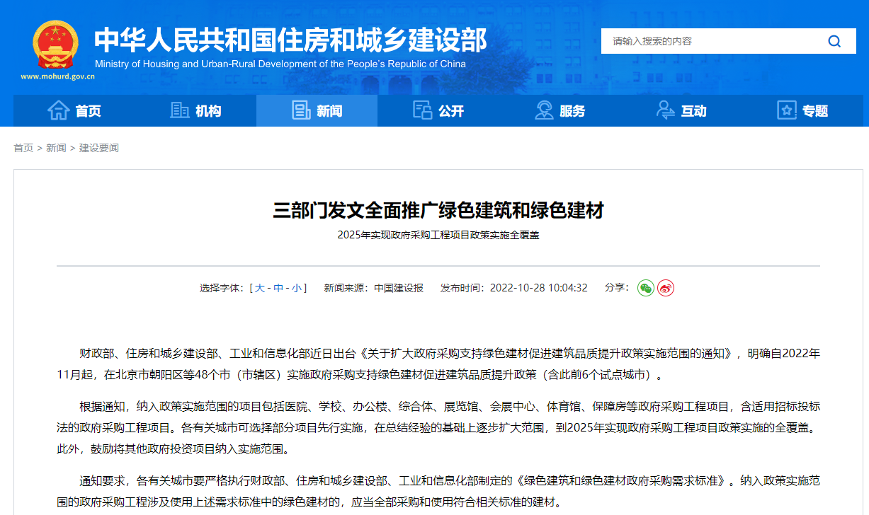 財政部、住房和城鄉(xiāng)建設(shè)部、工業(yè)和信息化部近日出臺《關(guān)于擴(kuò)大政府采購支持綠色建材促進(jìn)建筑品質(zhì)提升政策實施范圍的通知》,明確自2022年11月起,在北京市朝陽區(qū)等48個市(市轄區(qū))實施政府采購支持綠色建材促進(jìn)建筑品質(zhì)提升政策(含此前6個試點城市)。根據(jù)通知,納入政策實施范圍的項目包括醫(yī)院、學(xué)校、辦公樓、綜合體、展覽館、會展中心、體育館、保障房等政府采購工程項目,含適用招標(biāo)投標(biāo)法的政府采購工程項目。各有關(guān)城市可選擇部分項目先行實施,在總結(jié)經(jīng)驗的基礎(chǔ)上逐步擴(kuò)大范圍,到2025年實現(xiàn)政府采購工程項目政策實施的全覆蓋。