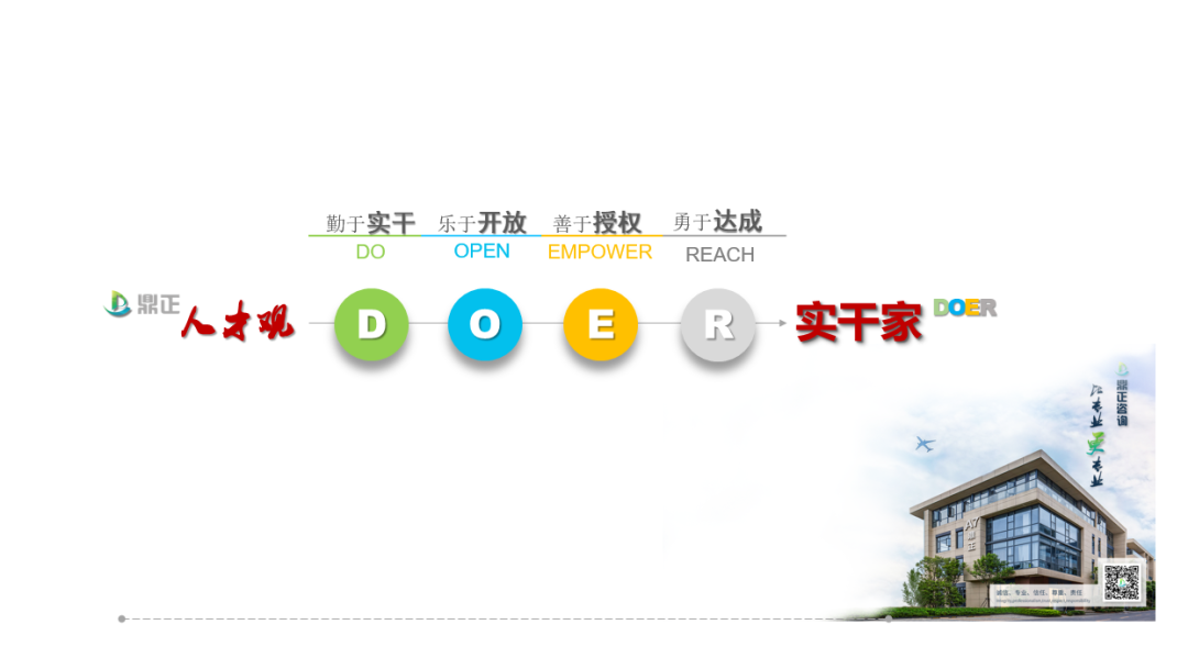 鼎正“DOER實(shí)干家”人才觀,是我們對人才認(rèn)知的基本價值觀,亦是人才發(fā)展成長的路徑,它能具體化指導(dǎo)同事們在工作中“對于自己、對于他人、對于團(tuán)隊(duì)、對于上級”分別能做些什么、該如何去做,從而調(diào)動和培養(yǎng)同事們發(fā)展的內(nèi)驅(qū)力和工作的協(xié)同性。