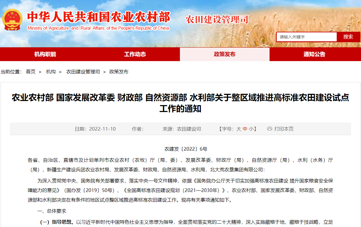 為深入貫徹黨中央、國務院有關部署要求,落實中央一號文件精神,依據《國務院辦公廳關于切實加強高標準農田建設 提升國家糧食安全保障能力的意見》(國辦發(fā)〔2019〕50號)、《全國高標準農田建設規(guī)劃(2021—2030年)》,農業(yè)農村部、國家發(fā)展改革委、財政部、自然資源部和水利部決定在有條件的地區(qū)試點整區(qū)域推進高標準農田建設工作。現將有關事項通知如下。