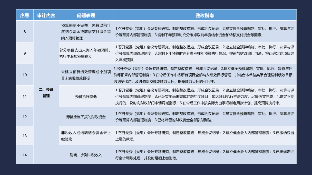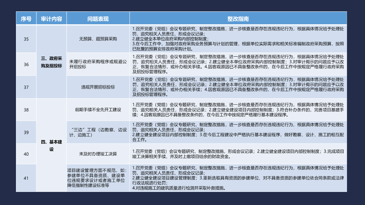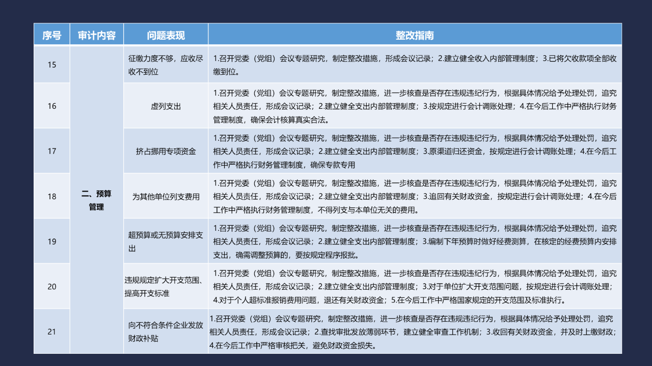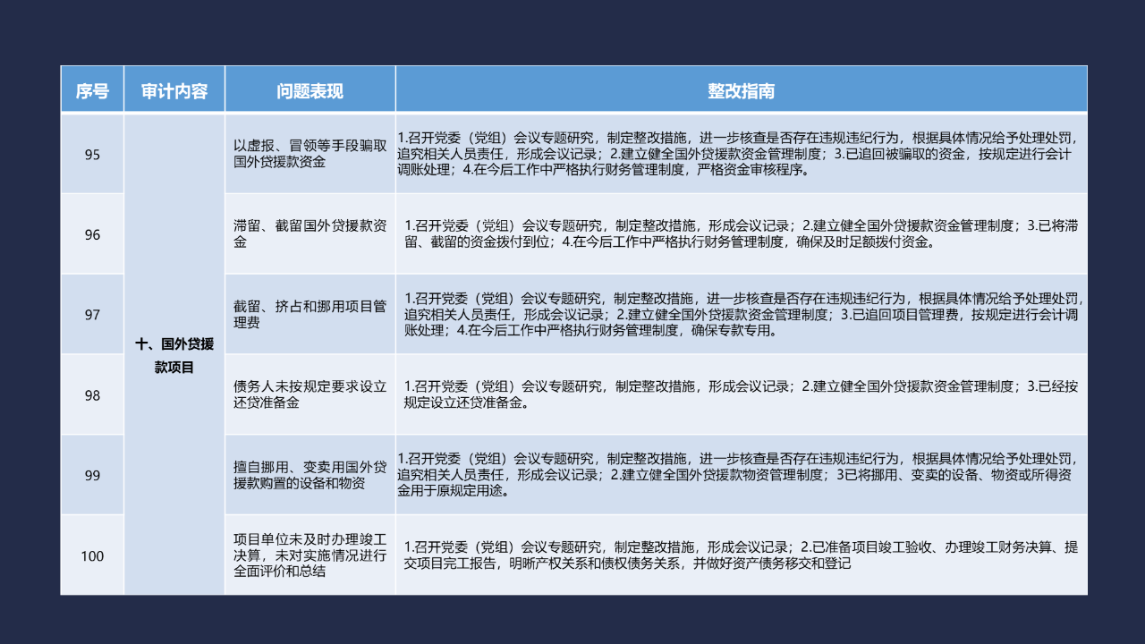 《整改指南100條》按照常見的重大政策措施落實(shí)、預(yù)算管理、政府采購及招投標(biāo)、基本建設(shè)、內(nèi)控管理、企業(yè)管理、自然資源、社保資金及安居工程、金融管理、國外貸援款共10類審計(jì)內(nèi)容進(jìn)行問題分類,列舉了100個(gè)常見問題并給出相對應(yīng)的整改方法說明,供審計(jì)機(jī)關(guān)和整改責(zé)任單位在審計(jì)整改工作中參照落實(shí)。