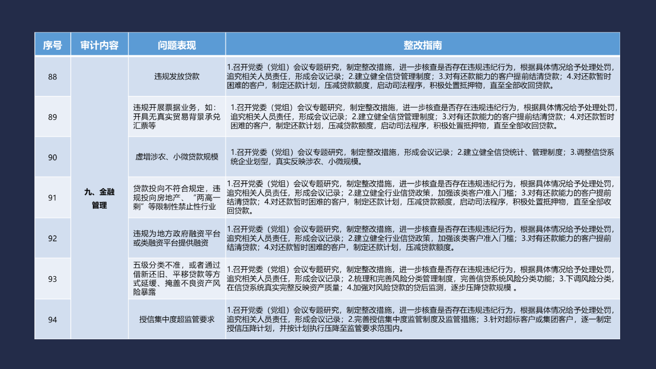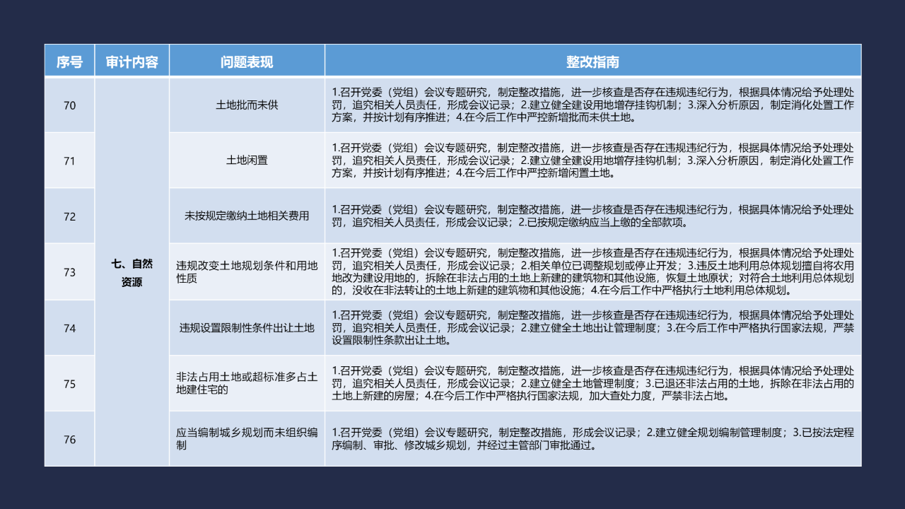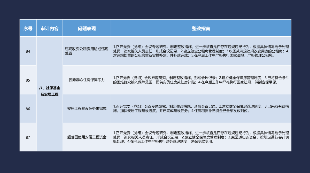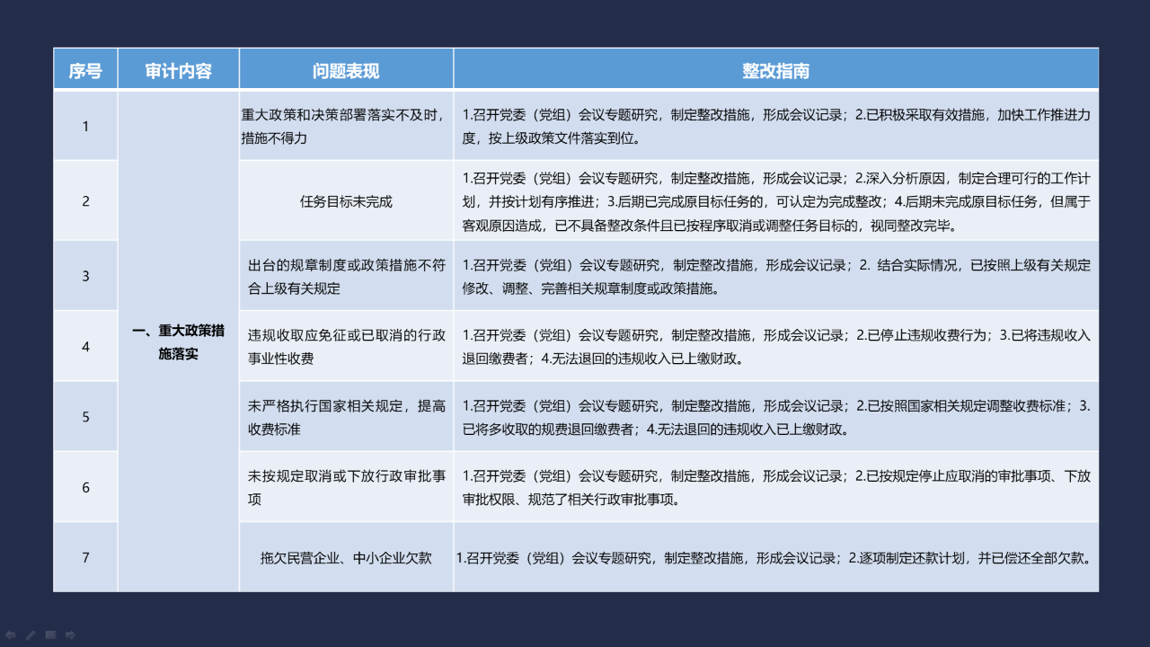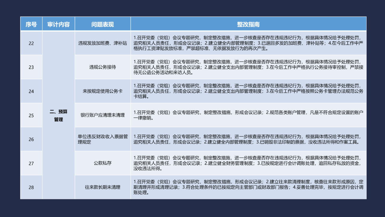 《整改指南100條》按照常見的重大政策措施落實(shí)、預(yù)算管理、政府采購及招投標(biāo)、基本建設(shè)、內(nèi)控管理、企業(yè)管理、自然資源、社保資金及安居工程、金融管理、國外貸援款共10類審計(jì)內(nèi)容進(jìn)行問題分類,列舉了100個(gè)常見問題并給出相對應(yīng)的整改方法說明,供審計(jì)機(jī)關(guān)和整改責(zé)任單位在審計(jì)整改工作中參照落實(shí)。