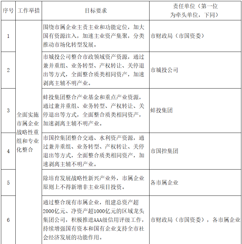 1.全面實施市屬企業(yè)戰(zhàn)略性重組和專業(yè)化整合。圍繞市屬企業(yè)主責主業(yè)和功能定位,加大國有資源注入,加速主業(yè)資產集聚,分類推動市場化轉型發(fā)展。市城投公司整合市政領域資產資源,蚌投集團整合產業(yè)基金和重點產業(yè)資源,市國控集團整合交通、水利資產資源,通過兼并重組、業(yè)務轉型、產權轉讓、關停退出等方式,全面整合質類相同資產,加速剝離主輔不明產業(yè)。除培育發(fā)展戰(zhàn)略性新興產業(yè)外,市屬企業(yè)原則上不得新增非主業(yè)項目投資。在此基礎上,通過整合現(xiàn)有市屬企業(yè),組建總資產超2000億元、凈資產超1000億元的區(qū)域龍頭集團公司,積極推進AAA級信用評級工作,持續(xù)增強國有資本和國有企業(yè)支持全市社會經濟發(fā)展的功能作用?!藏熑螁挝唬菏胸斦郑ㄊ袊Y委),各市屬企業(yè)〕