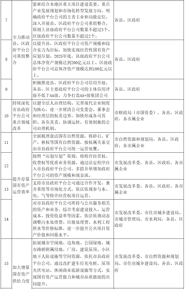 2.全力推動縣、區(qū)政府平臺公司重組整合。各縣、區(qū)政府(市高新區(qū)管委會、市經開區(qū)管委會,下同)要緊密結合本地區(qū)重大項目建設需要、重點產業(yè)發(fā)展規(guī)劃和市場化轉型發(fā)展方向,明確政府平臺公司的主責主業(yè)和功能定位,深入開展縣、區(qū)政府平臺公司重組整合,充分發(fā)揮資源集聚優(yōu)勢。原則上縣級政府平臺公司數(shù)量不超過3個、區(qū)級政府平臺公司數(shù)量不超過2個。以提升縣、區(qū)政府平臺公司資產規(guī)模和綜合實力為目標,加快實現(xiàn)經營性國有資產應劃盡劃。2025年底,縣級政府平臺公司總體凈資產規(guī)模達到200億元以上、區(qū)級政府平臺公司總體凈資產規(guī)模達到100億元以上。積極推進縣、區(qū)政府平臺公司信用升級,各縣、區(qū)主要政府平臺公司的主體信用評級不低于AA級,力爭打造AA+級集團公司。(責任單位:各縣、區(qū)政府)