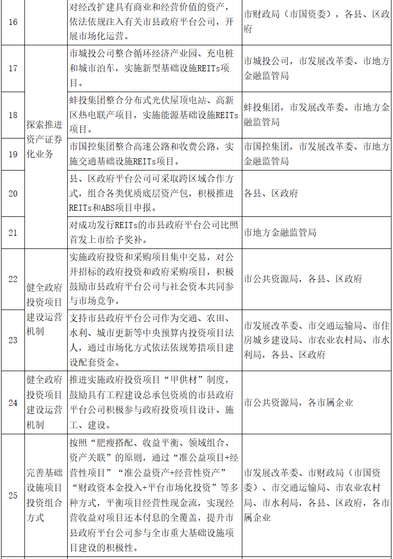 6.探索推進資產證券化業(yè)務。市城投公司整合循環(huán)經濟產業(yè)園、充電樁和城市泊車,實施新型基礎設施REITs項目;蚌投集團整合分布式光伏屋頂電站、高新區(qū)熱電聯(lián)產項目,實施能源基礎設施REITs項目;市國控集團整合高速公路和收費公路,實施交通基礎設施REITs項目。縣、區(qū)政府平臺公司可采取跨區(qū)域合作方式,組合各類優(yōu)質底層資產包,積極推進REITs和ABS項目申報。2025年底前,市屬企業(yè)力爭發(fā)行REITs不低于2支,募集資金規(guī)模不低于50億元。對成功發(fā)行REITs的市縣政府平臺公司比照首發(fā)上市給予獎補。(責任單位:市發(fā)展改革委、市地方金融監(jiān)管局、各縣、區(qū)政府,各市屬企業(yè))