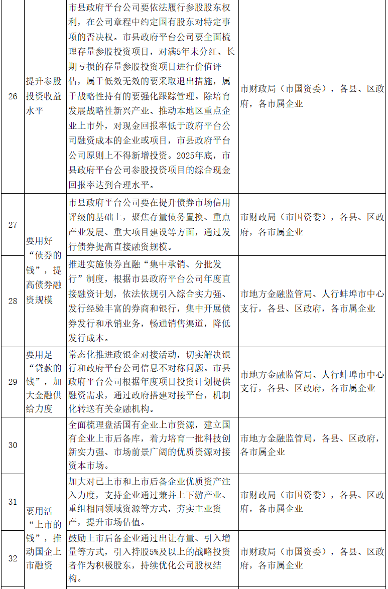 (四)持續(xù)提升融資能力。2025年底,市屬企業(yè)培育2戶以上國有控股企業(yè)在主要資本市場成功上市。市縣政府平臺公司直接融資規(guī)模超過300億元,間接融資規(guī)模超過400億元。