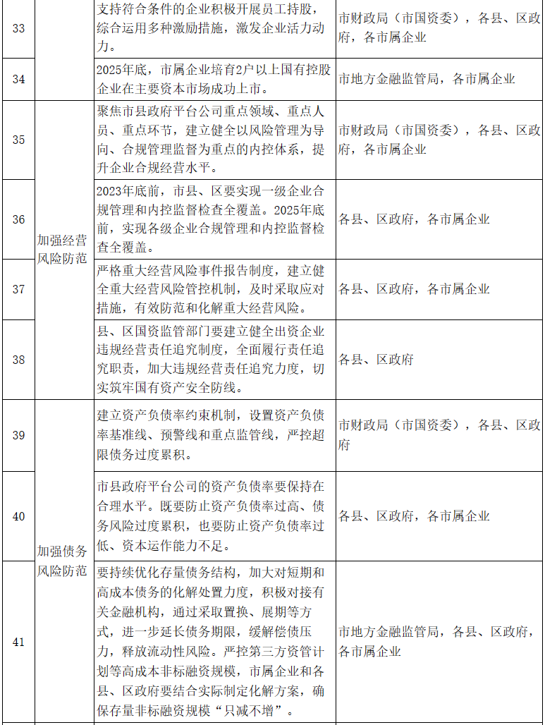 (五)切實加強風險防范。2025年底,市縣政府平臺公司實現(xiàn)對經營、債務、擔保等全方位、全流程的風險管控,抗風險綜合能力進一步增強。企業(yè)合規(guī)管理和內控監(jiān)督檢查實現(xiàn)全覆蓋,合規(guī)經營水平切實提高。存量債務結構趨于合理,債務期限和成本進一步優(yōu)化。對外擔保規(guī)??傮w合理,擔保風險基本可控。政府隱性債務化解完成既定任務目標。