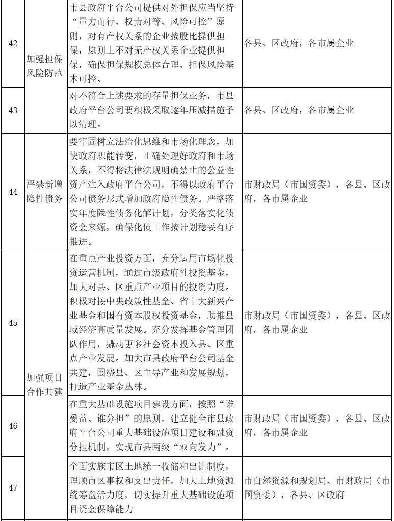 16.嚴禁新增隱性債務。要牢固樹立法治化思維和市場化理念,加快政府職能轉變,正確處理好政府和市場關系。不得將法律法規(guī)明確禁止的公益性資產注入政府平臺公司,不得以政府平臺公司債務形式增加政府隱性債務。嚴格落實年度隱性債務化解計劃,分類落實化債資金來源,確保化債工作按計劃穩(wěn)妥有序推進。〔責任單位:市財政局(市國資委),各縣、區(qū)政府,各市屬企業(yè)〕