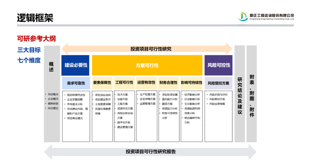 《可行性研究報告編制大綱(2023年版)》的頒布實施,對于我國新時代投資項目科學(xué)決策、推動實現(xiàn)高質(zhì)量投資具有里程碑意義,鼎正作為一家綜合性咨詢企業(yè),多年來深度服務(wù)湖北省及下屬多個縣市區(qū)的經(jīng)濟(jì)建設(shè),在全過程工程咨詢、投融資咨詢、專項債咨詢、國債咨詢、PPP咨詢等,積累了良好的理論基礎(chǔ)與品牌口碑,并從咨詢實踐中摸索出一套“向前、向后、向綠色”的高質(zhì)量咨詢產(chǎn)品線,能夠提供高質(zhì)量全方位的咨詢服務(wù)。