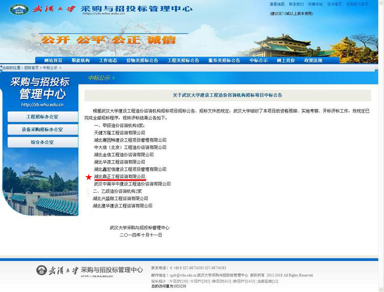 我公司入圍武漢大學(xué)建設(shè)工程造價咨詢機構(gòu)信息庫,此次遴選面向全國工程造價咨詢企業(yè)進行招標(biāo),共入圍10家企業(yè),主要為武漢大學(xué)提供建設(shè)工程項目工程量清單與招標(biāo)控制價編制與審核、全過程造價控制、竣工結(jié)算審核等相關(guān)服務(wù)。