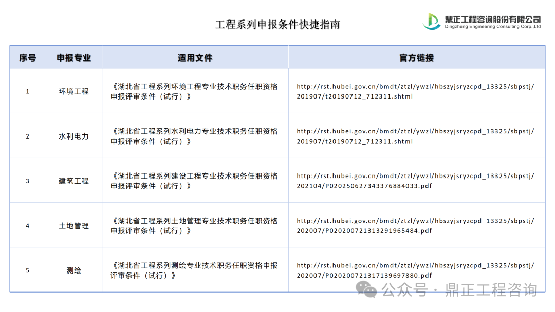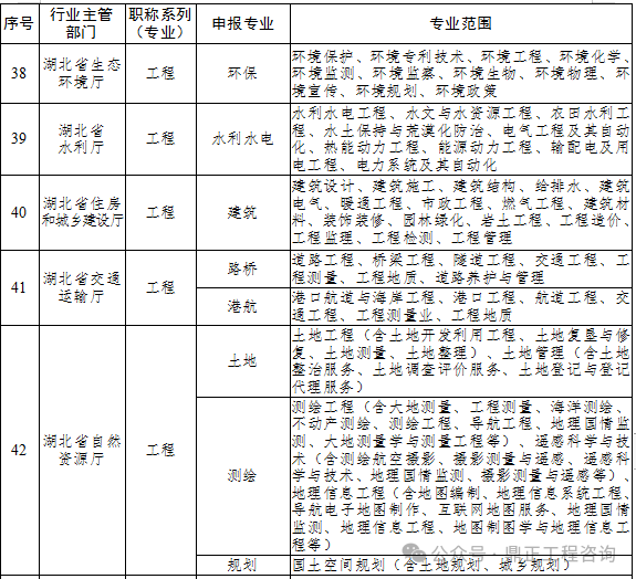 鄂職改辦已下發(fā)《湖北省職稱(chēng)評(píng)審專(zhuān)業(yè)目錄》(鄂職改辦〔2021〕46號(hào)),其中工程系列已涵蓋環(huán)保、水利水電、建筑、土地、測(cè)繪、規(guī)劃等相關(guān)專(zhuān)業(yè),詳見(jiàn)下圖: