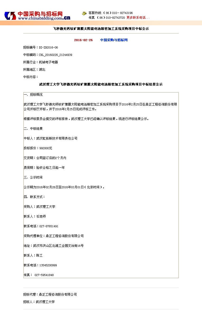 飛秒激光鈣鈦礦薄膜太陽能電池精密加工系統(tǒng)采購項(xiàng)目中標(biāo)公示