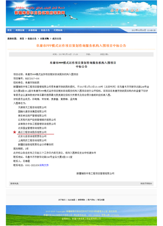 近日,新疆維吾爾自治區(qū)采購(gòu)網(wǎng)公布了阜康市PPP模式運(yùn)作項(xiàng)目策劃咨詢服務(wù)機(jī)構(gòu)入圍項(xiàng)目中標(biāo)公告,我司成功入圍。