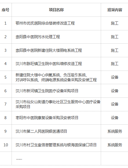 截止目前我司已為鄂州、咸寧、漢川、襄陽等地區(qū)的公立民營醫(yī)院及基層醫(yī)療衛(wèi)生機(jī)構(gòu)提供了30多個(gè)項(xiàng)目的招采服務(wù)。